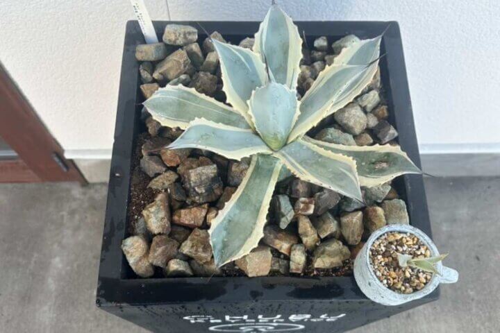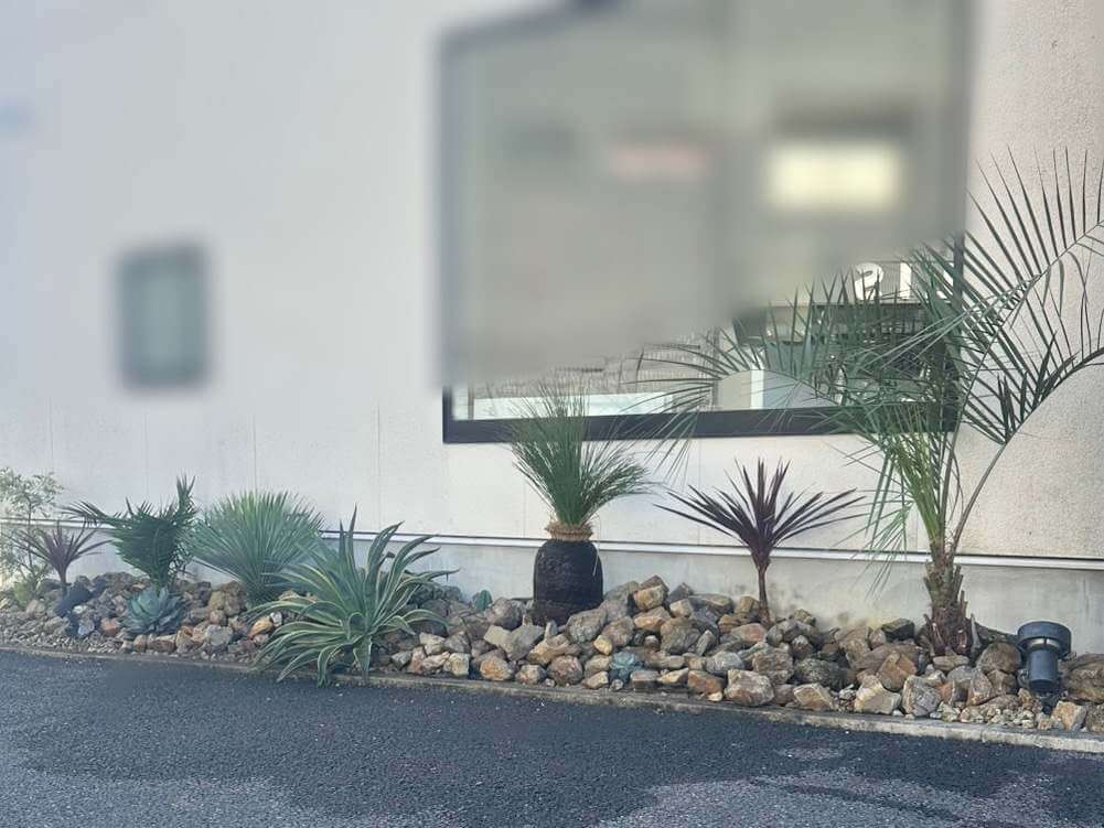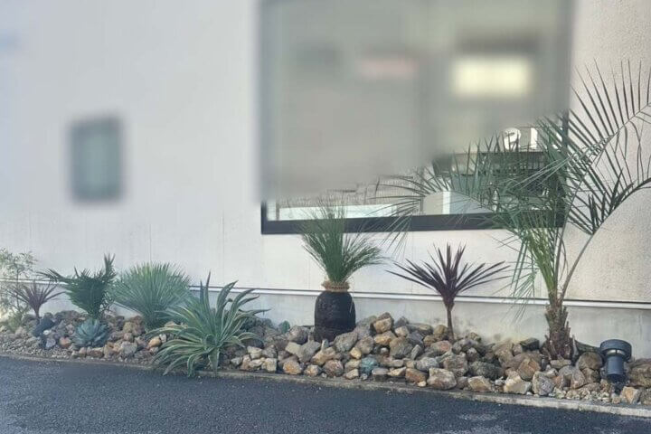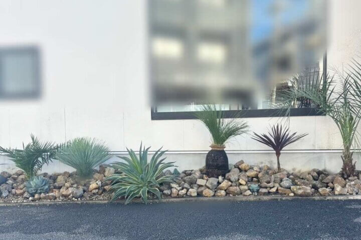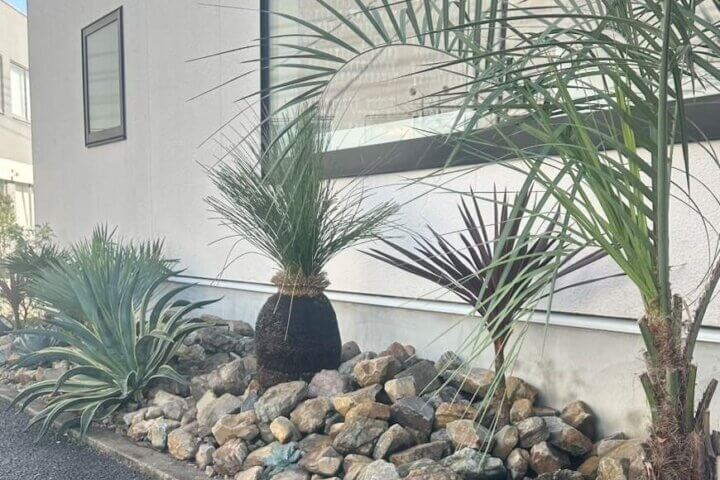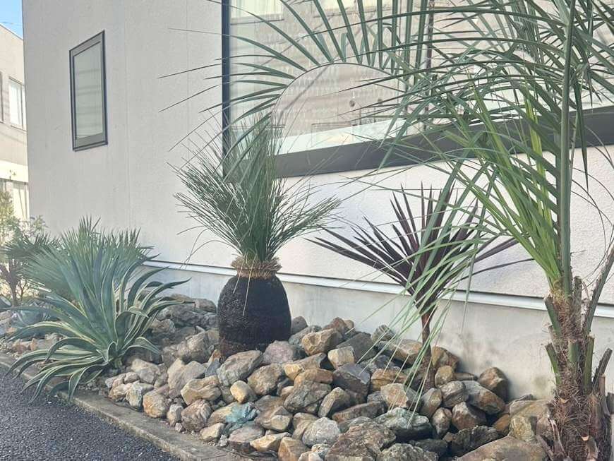 組み合わせた大胆な外回りに仕上げました。ポイントで小さなアガベを